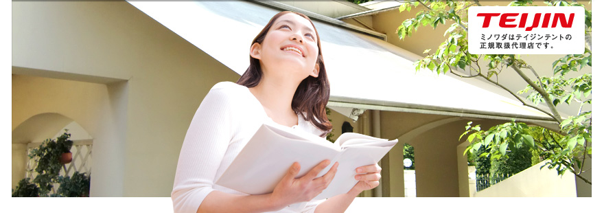 日よけや雨よけ、看板として利用される固定式テントを販売します。文字やイラストを自在に盛り込めるので、個性的な装飾が可能です。